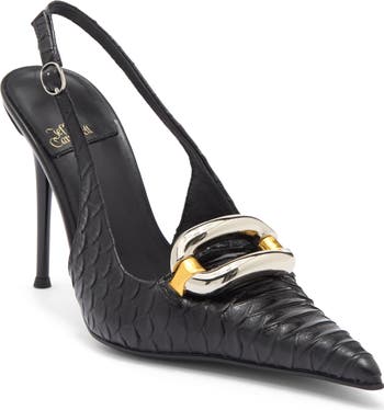 Mixed-media hardware gleams at the instep and highlights the pointy toe of a fierce slingback pump featuring a snake-embossed leather upper and lofted by a tapered pin heel.