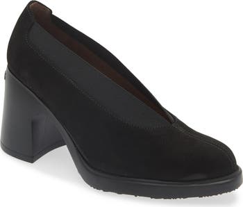 A stable block heel elevates a gel-cushioned pump that features a signature envelope topline.
