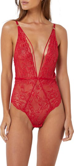 Bring some shimmer to your boudoir looks with this slightly metallic floral lace teddy fashioned with adjustable straps and scalloped edges.