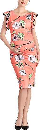 Sleeveless striped top and contrasting solid color accents this sophisticated bodycon dress. The top portion features a scoop neckline and flattering ruched side details that enhances the bump. Made with a super soft stretch knit fabric for easy fit and all day comfort.