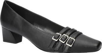 A trio of buckled straps create an edgy aesthetic on a cushioned faux-leather pump featuring a slender square toe and underslung block heel for comfortable balance.