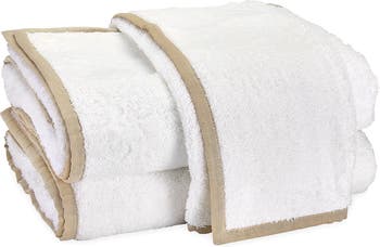 A luxurious bath towel is cut from soft cotton terry cloth and is finished with rich half-inch linen piping that will add a sophisticated touch to your bath.