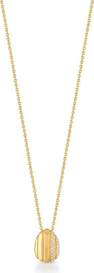 Textured is carved into the pendant of this 18-karat-gold necklace with precise ribbing and pavé diamonds.