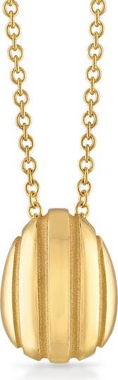 Textured ridges catch the light on a dainty egg pendant necklace crafted in Rhode Island from polished 18-karat yellow gold.