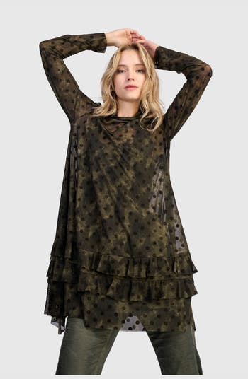 This romantic mesh tunic blends structured shape with soft movement. Tiered ruffles flow from the A-line cut, and a draped mock neck adds elevated dimension. Sheer yet substantial, it includes a slip for coverage. Wear it to introduce texture and drama to everyday layering.