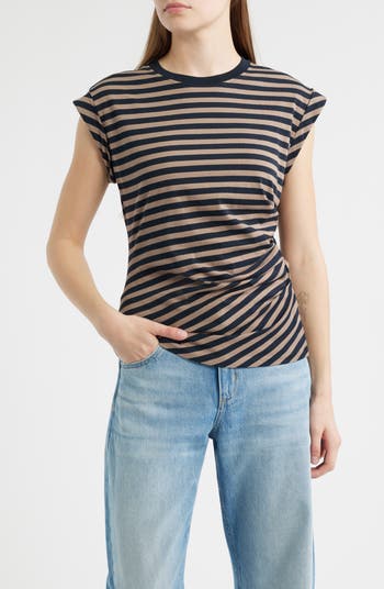 Pleating at one side creates a shapely silhouette on this arm-baring muscle T-shirt cut from cotton jersey encircled in classic stripes.