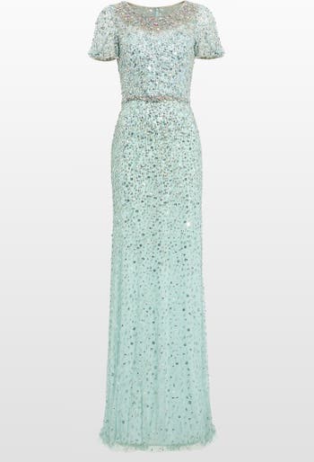 Blending timeless romance with refined detailing, this gown features a softly structured bodice and delicate sheer overlay; it is framed by short sleeves and an elegant round neckline adorned with shimmering embellishment. The fitted waist is defined with subtle sparkle, flowing into a graceful skirt scattered with sequins that catch the light with every step. A graceful choice for occasions that call for subtle drama and enduring sophistication.