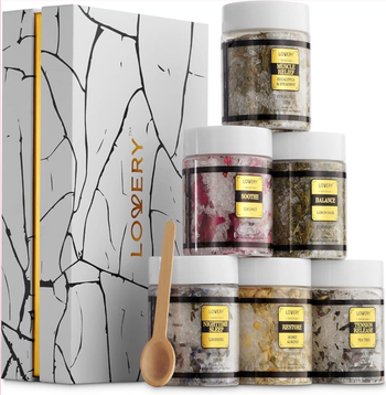 Deluxe Epsom bath salts gift set - give the gift of luxury and relaxation to your loved ones with Lovery's deluxe Epsom bath salts! Each salt comes in a jar & contains 120 grams of lavender Epsom salt, tea tree Epsom salt, lemon basil Epsom salt, coconut Epsom salt, honey almond Epsom salt, eucalyptus spearmint Epsom salt – packed in an elegant marble and gold gift box.