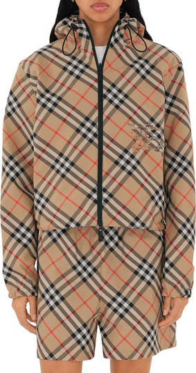 Burberry's Equestrian Knight makes a gallant appearance on this lightweight hooded jacket that reverses from house-check twill to a solid hue.