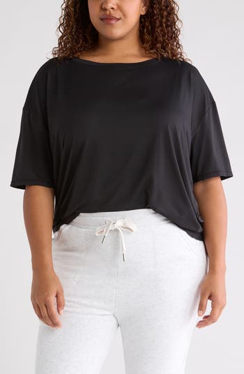 Four-way stretch and moisture-wicking properties make this swingy T-shirt a perfect partner for working (or just hanging) out. A high-low hemline lends extra outfitting versatility to the look.