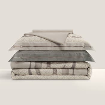 - The bed linen, crafted from rare, long-staple Egyptian cotton with a luxurious 400-thread count, exudes classic sophistication in gentle hues of muted grey and brown.