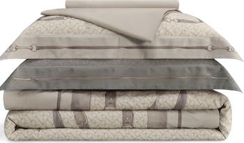 - The bed linen, crafted from rare, long-staple Egyptian cotton with a luxurious 400-thread count, exudes classic sophistication in gentle hues of muted grey and brown.