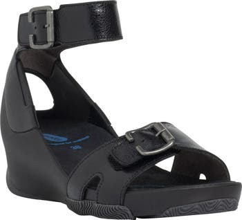 Elegance meets comfort on this modern ankle-strap sandal designed with easy hook-and-loop closures below the stylish decorative buckles. It's set on a modest wedge heel that offers a hint of height with extra stability thanks to the cork footbed and supportive heel cup.