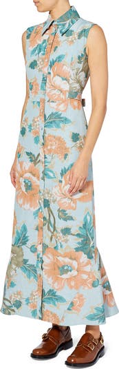 This linen-blend shirtdress gets its romantic appeal from a retro floral print, a beautifully flared skirt and an unexpected reveal at the crossover back.