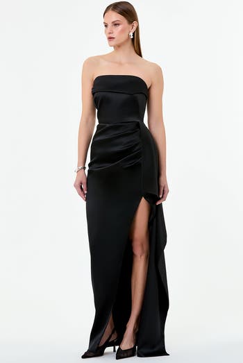 An elegantly structured strapless gown in lustrous satin, detailed with soft pleating and flowing side ruffles for added movement.