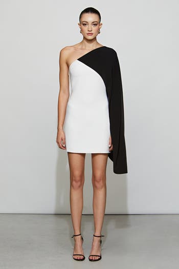 Sharp contrasts juxtapose chic femininity in this compact cady mini dress, featuring a dramatic one-shoulder silhouette and asymmetric drape—a striking statement for a night out.
