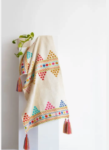 Our festive Erika Throws are meticulously handcrafted in Chiapas, Mexico, using wool from locally raised sheep. Each piece is woven on a traditional loom and adorned with vibrant hand embroidery, adding a lively touch of color. Perfect as a cozy accent throw or draped beautifully at the foot of a bed, the Erika Throw brings warmth and charm to any space. Please note that the dimensions do not include the tassels at the corners. Due to their handmade nature, dimensions will vary slightly.