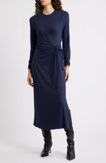 A softly draped side tie defines the waist of this long-sleeve midi dress made from smooth stretch-knit fabric.