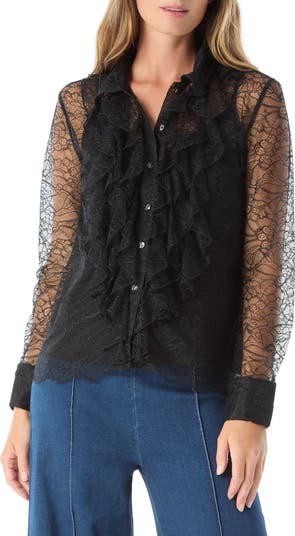 Delicate lace and a cascading jabot and scalloped hem imbues this airy button-up shirt with pure romance.