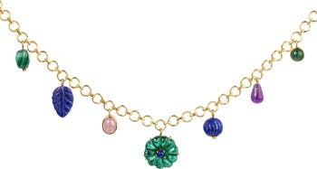 Multi-charm necklace with malachite, morganite, amethyst, green onyx and lapis lazuli. Handmade chain with lobster clasp fastening.