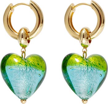 These drop earrings boast a sweet mix of rich colors, with shimmering gold flecks swirling throughout. The handmade heart-shaped dangles adorned with gold hoops make the earrings chic and modern in their beauty. The glaze colors are achieved by adding minerals into the glass and will never fade.