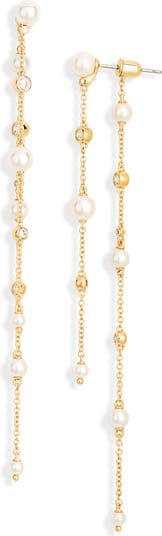 Faux pearls and cubic zirconia alternate down dainty chains in these 18-karat gold-plated earrings that swing from the front and back of your lobes.