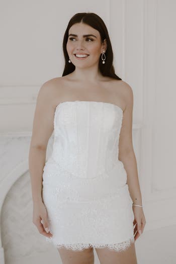 Clean, chic, and undeniably sultry. Esme stuns with a strapless satin corset that cinches the waist and a sleek, body-skimming lace mini skirt that flatters every angle. Minimalist in design, maximum in impact, she’s the dress you throw on when you want to turn heads with zero effort.