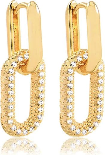 The Esmeralda Earrings feature double-lock rectangular pave hoops. The front surfaces of the bottom hoop is fully encrusted with micro‑pavé cubic zirconia, creating the bit of edge you need.