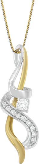 Complete your gorgeous look with this intertwined swirl pendant. Constructed of 10 karats two-toned gold in white and yellow, it has a unique design. The embellishment with glittering round cut diamonds adds a touch of shimmer to this pendant. Further, it captures a round cut diamond solitaire, which is taking its elegance to the next level.