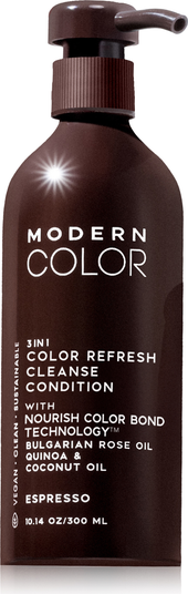 Modern Color’s Espresso 3-in-1 Color Refresh + Cleanse + Conditioner adds a cool brown tone while cleansing and conditioning in one step. This semi-permanent formula refreshes hair color, enhances shine, and improves manageability. Ideal for both natural and color-treated hair, it keeps brunette tones rich and vibrant between salon visits without compromising hair health.