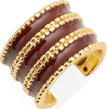 Enamel inlays emphasize the layered look of this chunky ring traced with beading and plated in 24-karat gold.