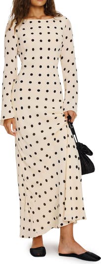 Enchanting polka dots artfully adorn this figure-skimming maxi dress framed by fluted long sleeves for added drama.