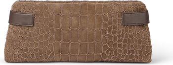 The typical texture of velvety suede harmoniously contrasts with the shimmering monili embroidery.