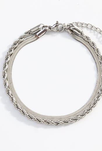 The classic, everyday, wearable, and stylish herringbone chain meets its ideal partner in the timeless rope chain. Joined at the clasp, this two-in-one bracelet is going to set your stack standard. Length: 6.5" + 1" Extender. Width: 3mm.