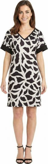 Stay effortlessly stylish with this petite black and white abstract print short sleeve t-shirt dress. Featuring a bold black and white print, this dress combines casual comfort with contemporary design. The loose fit and knee length silhouette create a relaxed yet flattering look, perfect for everyday wear. Crafted with a soft polyester blend, this V neck T shirt dress offers breathable comfort and easy styling for a day at the office or a casual outing.