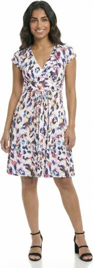 Exude timeless sophistication in this 24seven Comfort Apparel petite white animal print V neck knee length dress. The chic cinched waist, a-line design, and cap sleeves create a flattering silhouette, while the trendy animal print adds a modern flair. Functional side pockets enhance its practicality. Crafted from a soft, stretch polyester blend, it offers comfort and style for workdays or evenings out. Machine washable for easy care.