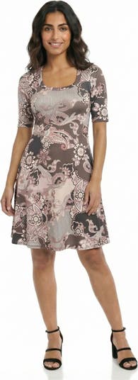 Elevate your wardrobe with this petite 24seven Comfort Apparel brown paisley print skater dress, featuring a flattering scoop neckline and elbow sleeves. The soft flare hemline and slim fit waist create a flattering silhouette, while the midi length adds timeless elegance. Crafted from a comfortable stretch fabric, this versatile, machine-washable dress is perfect for layering or wearing on its own, making it a staple for every season.