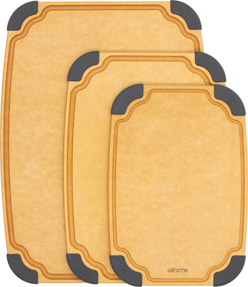 Essential Series 3-in-1 Set Includes: 10 inches by 7 inches, 12 inches by 8 inches, 14 inches by 10 inches, perfect fit for your kitchen and culinary needs, whether you're prepping a quick snack or cooking a large family meal. Non-Slip Feet | The cutting board set comes equipped with non|slip feet on each of its four corners, providing a firm grip on any type of countertop. With these feet, the board stays in place during usage, preventing any slipping, sliding or shifting, and minimizing the risk of harm from sharp knives. The set boasts a thickness of 6mm, ensuring sturdiness and durability for long|term use. Additionally, the board is reversible, meaning it can be used on both sides, making it a versatile addition to your kitchen. Juice Groove Design | The cutting board features a juice groove design, which effectively catches flour, crumbs, liquids, and even sticky or acidic drippings, preventing them from spilling over the counter. This thoughtful feature helps to keep your kitchen clean and tidy, while also making it easier to maintain and food safety standards. Food Icon Design | This cutting board features a selection of food icons, including fruits, cooked food, raw food, and vegetables. With these helpful icons, it serves as a valuable tool to help you stay on track with your health goals, encouraging you to incorporate a variety of nutritious foods into your diet. Whether you're preparing a meal or just looking for a little inspiration, this cutting board is an excellent addition to any kitchen. Knife Friendly | The cutting surface of this board is knife|friendly, as it is both non|porous and ultra|strong, ensuring that it won't damage or dull your knives during use. Not only is it gentle on cutlery, but it is also easy to clean, making meal prep a breeze. This surface can withstand the rigors of slicing and dicing, even with sharp knives, and is resistant to stains and odors, ensuring long|term use without any unwanted smells or discoloration. Eco Friendly | Crafted from sustainable high|density pine leaf material, this fiber|wood cutting board is an eco|friendly choice for your kitchen. Its perfect size makes it ideal for daily meal preparation, whether you're chopping vegetables or meat. Thanks to its reversible design with double-sided cutting surfaces, you can easily switch between sides for different types of foods. This versatile cutting board allows you to explore endless culinary possibilities while reducing your carbon footprint. Dishwasher Safe & Heat Resistant