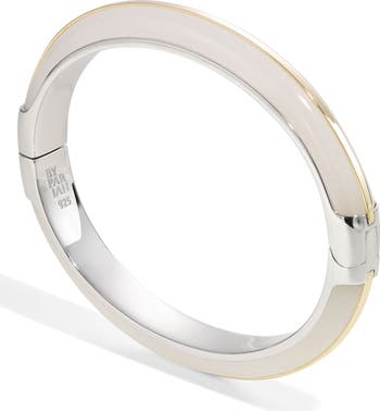 White jasper glows in the tubular channels of a sleek and modern bangle that beams in the versatile two-tone of sterling silver and 14-karat gold.