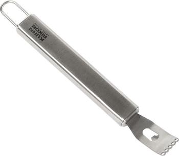 The Kuhn Rikon Essential Citrus Zester is designed for creating thin strips of citrus peel for cocktails, garnishes, and cooking. The stainless steel zester head removes flavorful citrus zest while leaving behind the bitter pith. Durable stainless steel construction ensures reliable performance for everyday kitchen and bar use. This versatile zester is ideal for lemons, limes, oranges, and other citrus fruits.