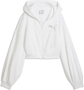 A sparkling rhinestone script flows from sleeve to sleeve across the back of an abbreviated zip-up hoodie that keeps the glam look going with a glittering logo at the chest. The cotton-blend French terry fabrication keeps you nice and comfortable, while balloon sleeves keep you on trend.