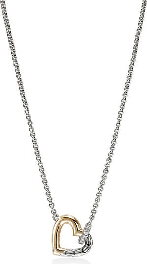 Polished 14-karat gold contrasts with carved sterling silver in this romantic necklace beaming with pavé diamonds.