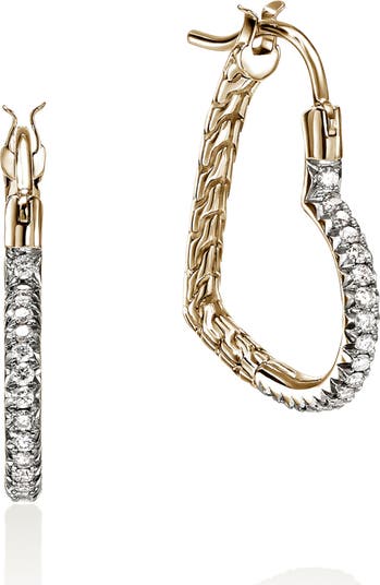 Signature chain-link engraving and diamond pavé bring light-catching texture to hoop earrings shaped as hearts.