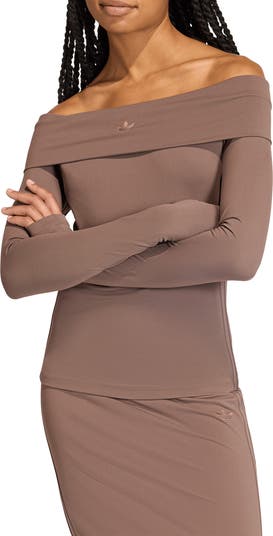 Monochrome 3-Stripes and an embroidered Trefoil bring signature sporty style to this stretchy off-the-shoulder top complete with stay-put thumbhole cuffs.