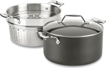 This large pot features high walls with removable stainless-steel basket and lid—perfect for steaming and poaching veggies and chicken.