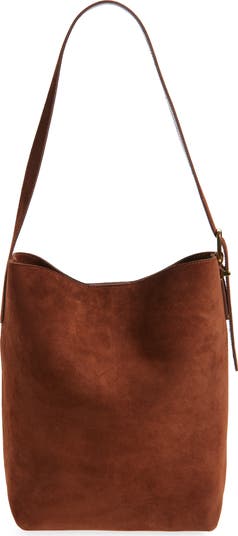 Cool, modern and quietly luxe, this suede bucket tote is perfectly sized to hold all of your everyday essentials.
