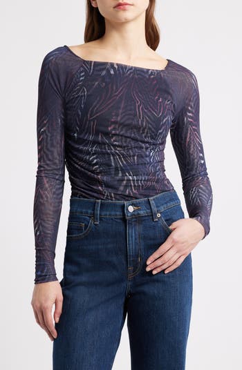 Soft pleats add texture and dimension to this airy mesh top covered in a mesmerizing print.