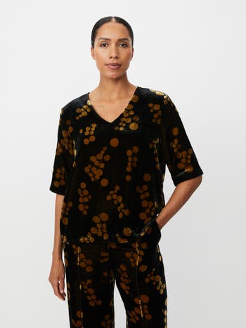 Introduce a touch of '70s vibes to your wardrobe with this stunning velour top. The soft fabric with a golden floral print catches the light, adding an exclusive, personal touch to your look. The top features a deep V-neck, short sleeves and a classic, straight cut that drapes lightly and effortlessly over the body. Style it with black trousers and heels for an elegant look – or make a cool statement with the matching velour trousers.