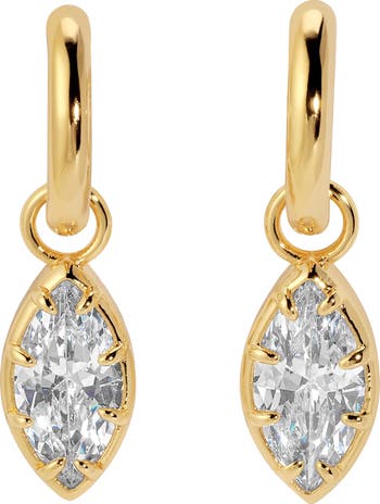 A sparkling stone accentuates the modern design of elegant drop earrings plated in 14-karat gold.