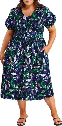 Puffed short sleeves frame this all-cotton midi dress covered in a bold floral print and popped with pockets at the sides.